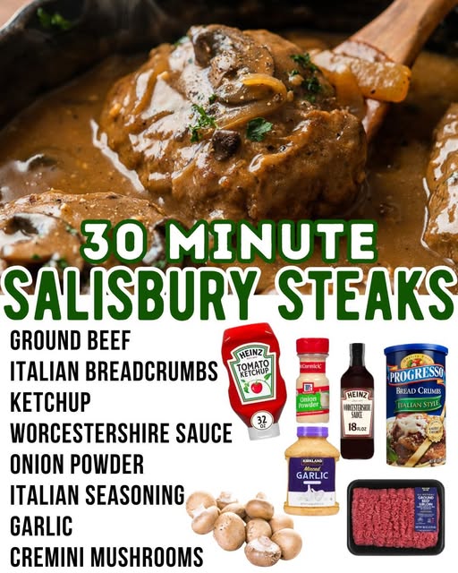 Hearty seasoned ground beef “steaks” are simmered in a rich mushroom gravy and served over creamy mashed potatoes for an easy weeknight meal. All you need is 30 minutes to whip up this super easy Salisbury Steak Recipe.