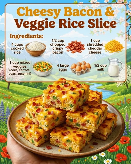 The Cheesy Bacon & Veggie Rice Slice is a clever way to transform simple pantry and fridge staples into a hearty, flavourful meal. Combining cooked rice, savoury bacon, grated vegetables, eggs, and cheese, it bakes into a golden slice that’s deliciously comforting while sneaking in extra veggies.