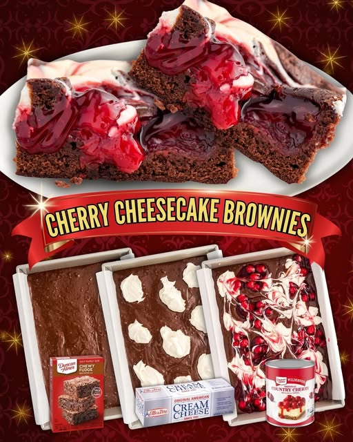 Evenly dollop heaping spoonfuls of the cream cheese mixture randomly onto the brownie batter. Make sure to leave space between cream cheese dollops for the cherry pie filling.1½ cups (about ¾ of a 21-ounce) can cherry pie filling