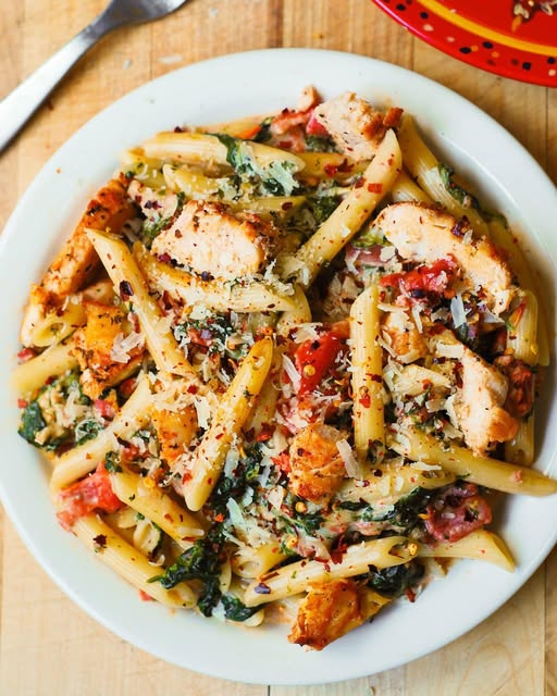 - Make the creamy sauce + add veggies: In the same pan, add heavy cream and bring to a boil. Stir in Parmesan, reduce to low-medium, and simmer until the cheese melts and the sauce is creamy, about 1-3 minutes. Add chopped tomatoes, spinach, garlic, and crushed red pepper; cook on medium just until the spinach wilts. Add sliced chicken and half the cooked bacon, then mix everything together.