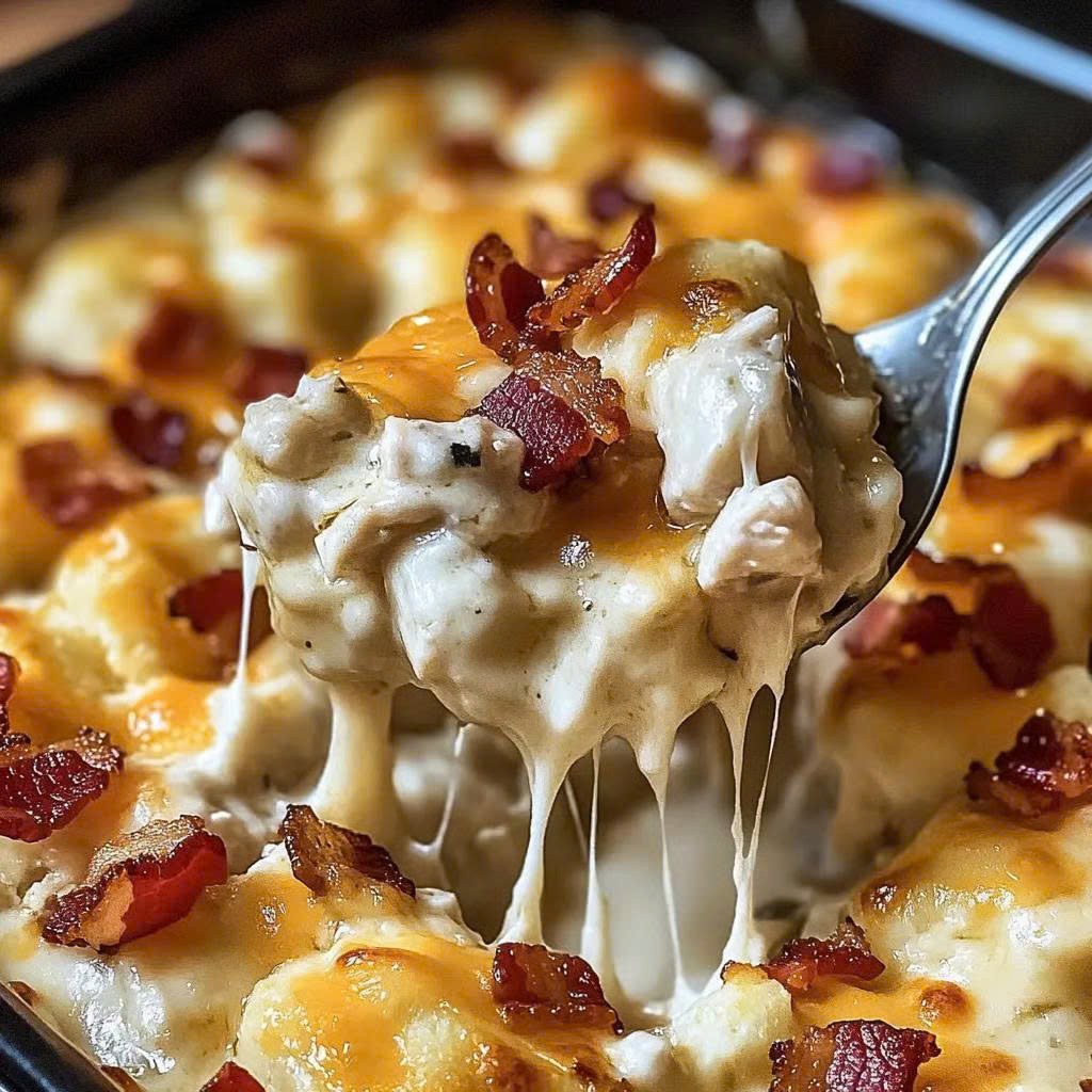 Loaded casserole with chicken, bacon, cheese, and ranch flavors topped with golden crispy tater tots for the ultimate comfort meal.