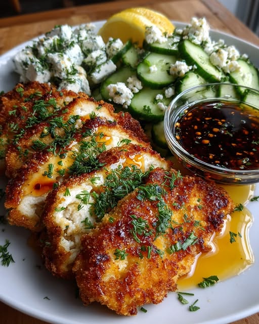 Crispy Hot Honey Lemon Feta Chicken Cutlets with Mediterranean Herb Crust & Cucumber