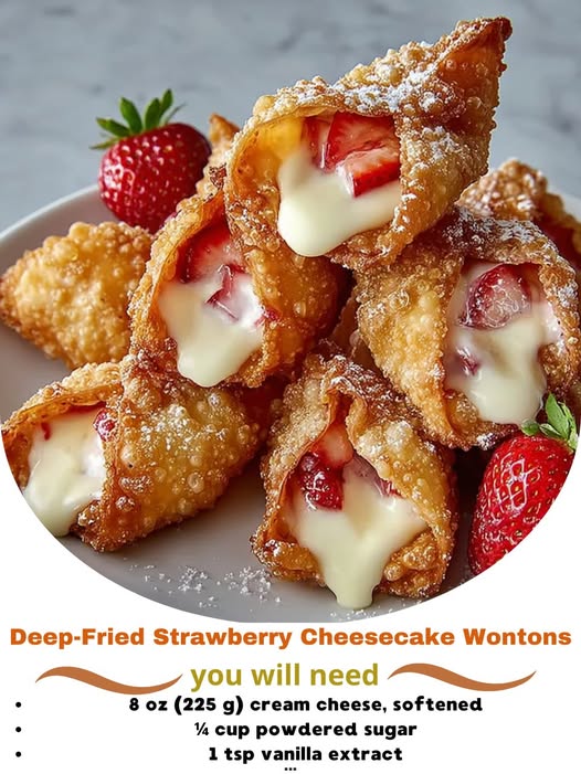 You only need a handful of ingredients — wonton wrappers, cream cheese, strawberries, sugar, and oil for frying — yet the result tastes like something from a gourmet dessert bar. Served with a dusting of powdered sugar or a drizzle of chocolate sauce, these wontons are crispy, creamy, fruity, and unforgettable.