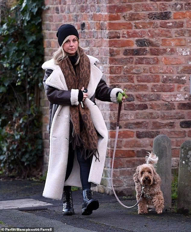 The Coronation Street star, 42, wrapped up in a long shearling jacket as she stepped out in Alderley Edge, Cheshire to walk her pet dog.