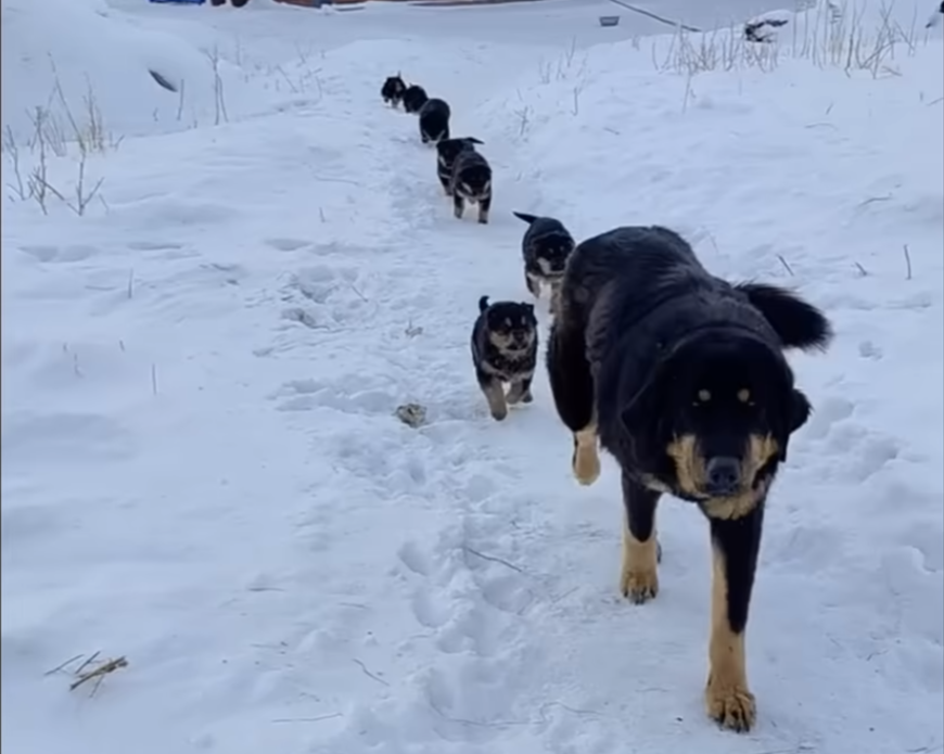 The story began when a man accidentally encountered a homeless dog family approaching his house. The sight was heartbreaking: a thin, exhausted mother dog leading her seven tiny puppies—barely over a month old—lining up in a long row to follow her through the deep snow.