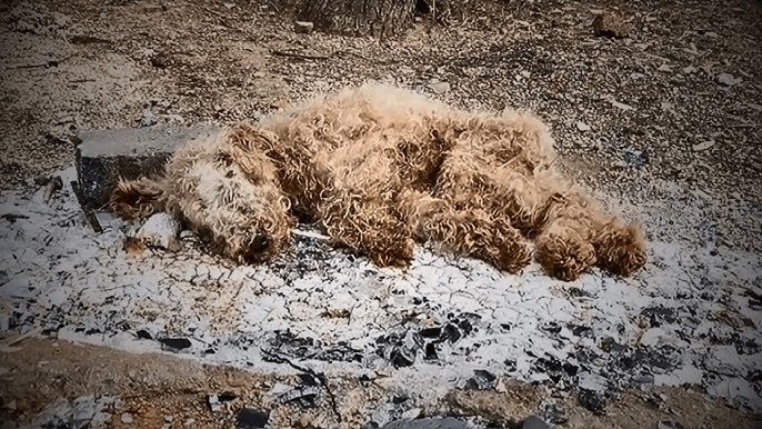 A stray dog lay dying beside the ruins, tears long dried up, having lost  all hope for life.