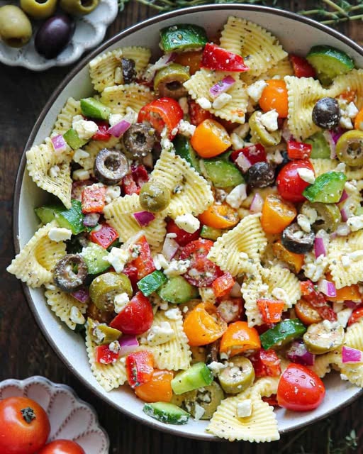 • This traditional Greek pasta salad features only tomatoes, cucumber, bell pepper, red onion, and feta cheese (no leafy greens). When combined in a salad, these ingredients keep well refrigerated and taste even better the next day as they marinate with the dressing and release juices!