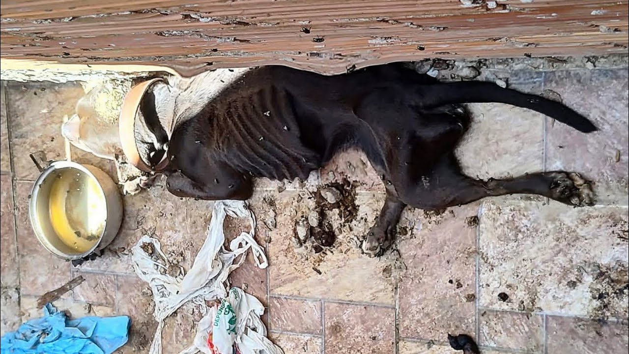 When rescuers and police arrived, they were met with a horrifying sight: Skank was completely exhausted, reduced to nothing but skin and bones, and had seemingly surrendered to his fate. The poor dog didn’t even have the strength to stand; his frail legs collapsed after just a few trembling steps. While Skank was rushed to emergency care, the abuser faced immediate justice and was taken into custody.