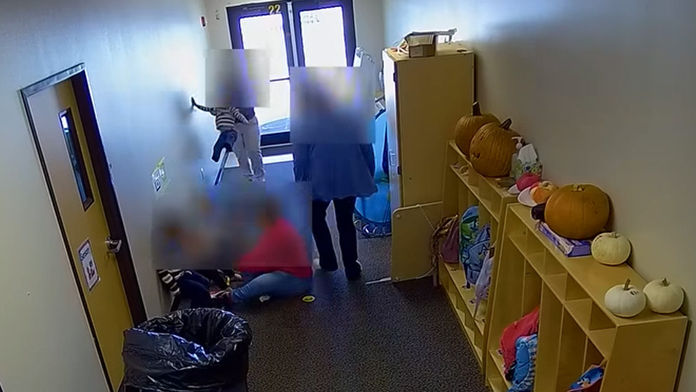 Footage from less than an hour before the incident shows the same teacher dropping her son. Another video afterward shows a different teacher kicking the boy’s injured ankle while appearing to try to get him to walk.