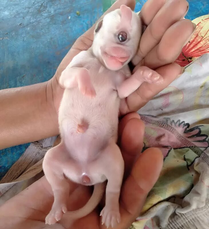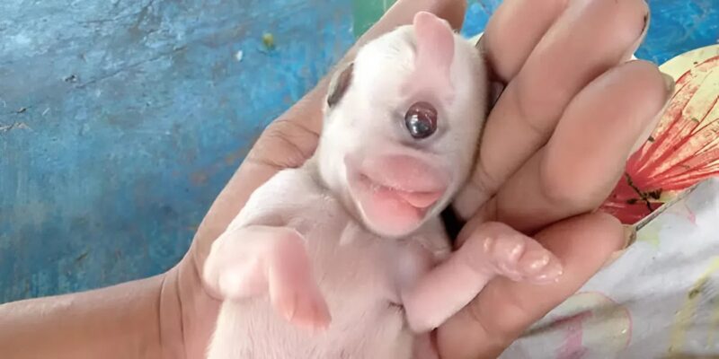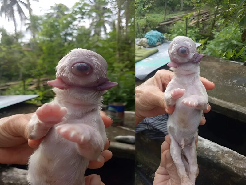 Instinct pulled me toward the source. I crouched and lifted a rusty metal crate leaning against a parked car. There, curled like a hopeless secret, was the tiny creature. Its body was weak, skin pale, fur barely visible. I couldn’t recognize what animal it was. And then its head lifted — one enormous eye blinking directly at me. No nose. No mouth. Just that one heartbreaking eye.
