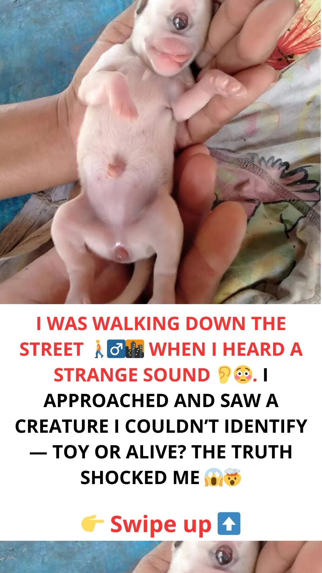 Instinct pulled me toward the source. I crouched and lifted a rusty metal crate leaning against a parked car. There, curled like a hopeless secret, was the tiny creature. Its body was weak, skin pale, fur barely visible. I couldn’t recognize what animal it was. And then its head lifted — one enormous eye blinking directly at me. No nose. No mouth. Just that one heartbreaking eye.