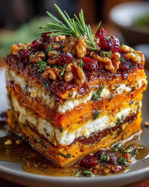 Layered Sweet Potato, Butternut Squash, Carrot Lasagna with Feta, Walnuts, and Cranberry-Honey Glaze