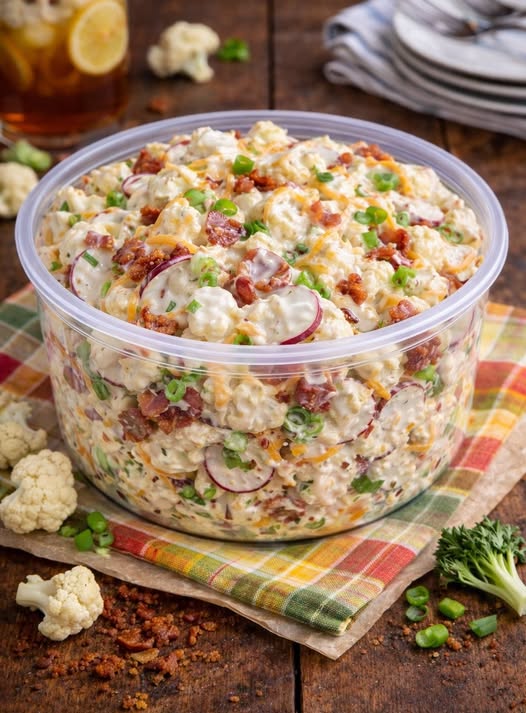 Yes. Cauliflower is naturally low in carbs and much lower than potatoes. When paired with bacon, cheese, and a creamy dressing, this salad fits perfectly into low carb and keto lifestyles while still feeling hearty and filling.