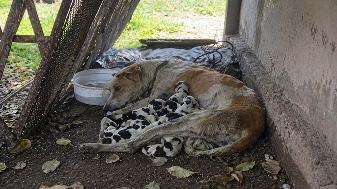 Aura gave birth to 11 puppies while her own body was exhausted from hunger and thirst. One by one, her babies withered away in pain because Aura did not have a single drop of milk left to nourish them. When the rescue team arrived, only a few weak puppies remained, struggling for breath beside a mother who was also on the brink of death.