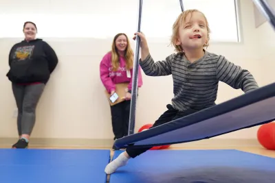 A motor room allows children who need movement to run, climb, slide or swing while therapists work with them and speak with parents.