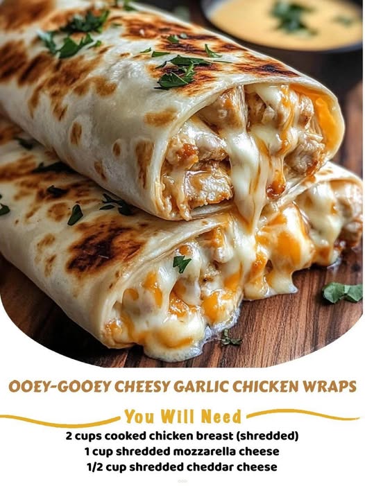 Ooey-gooey cheesy garlic chicken wraps combine melty mozzarella, tender shredded chicken, and a creamy blend of cream cheese, sour cream, and garlic, all wrapped in a flour tortilla and baked to golden perfection. Each bite offers a satisfying mix of cheesy stretch, tangy flavor, and garlicky goodness. Brushed with melted butter and Parmesan for extra crunch, these wraps are finished with a touch of fresh parsley. They work beautifully as a quick dinner, a hearty lunch, or a crowd-pleasing shareable snack. Customize the filling or spice level to fit your taste. Serve warm for the ultimate comfort food experience.