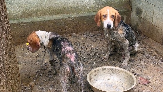The story begins in a deserted area where two Beagles were discovered left among trash and cold debris. Both were suffering from severe malnutrition, with their ribs clearly visible under thin skin and coats infested with parasites. Their eyes reflected deep fatigue, having seemingly lost the sharp instincts typical of their breed.