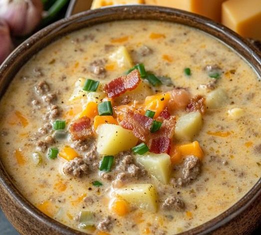 This hearty Cheesy Burger Flavored Soup captures the delicious, savory taste of a cheeseburger in a comforting bowl. Lean ground beef, hash browns, and aromatics are slow-cooked in a rich, tangy broth and finished with heavy cream, cheddar cheese, and bacon.