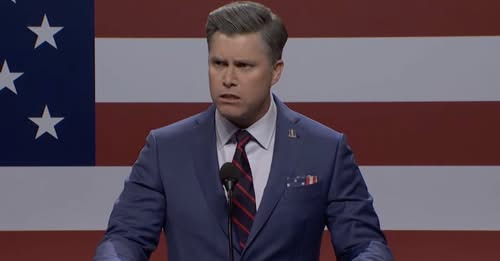 “‘Cause this is serious. We’re facing the greatest threat to freedom and democracy the world has ever known. And we all know what that threat is,” he started, before being interrupted by James Austin Johnson’s Donald Trump, who burst in with, “Late-night TV.”