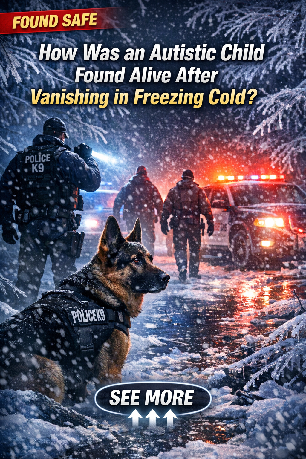 The track led officers approximately 200 yards from the child’s home to an abandoned vehicle on nearby property, where the boy was found curled up inside. Police said he was very cold but otherwise healthy.