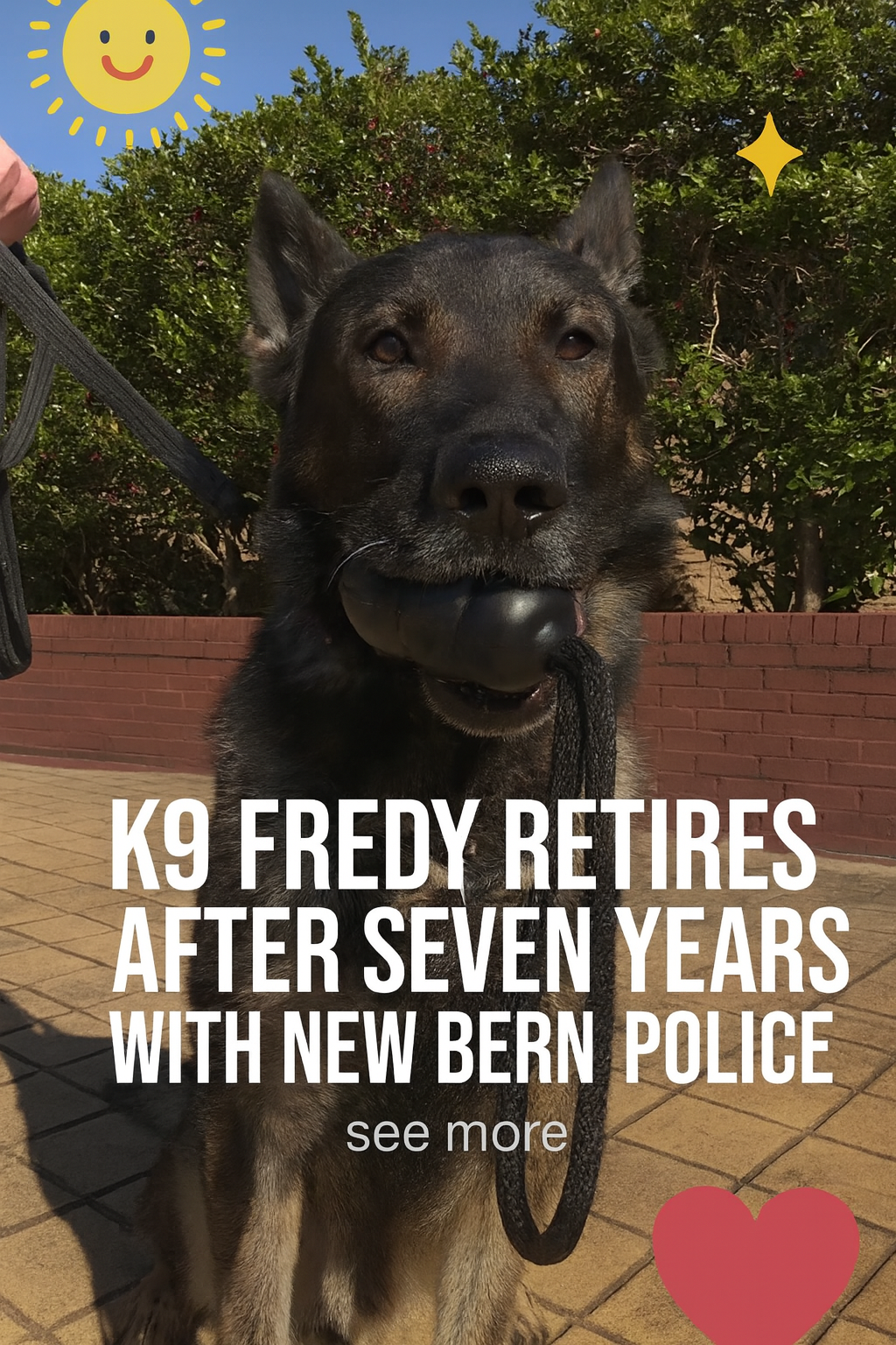 K9 Fredy is an eight-year-old German Shepherd. He was sworn in with the New Bern Police Department in 2019 with his handler, Geoffrey Fulton.