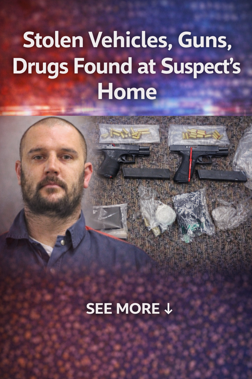 The search yielded two stolen vehicles and one stolen trailer on the property. Detectives also seized a gun and suspected methamphetamine.