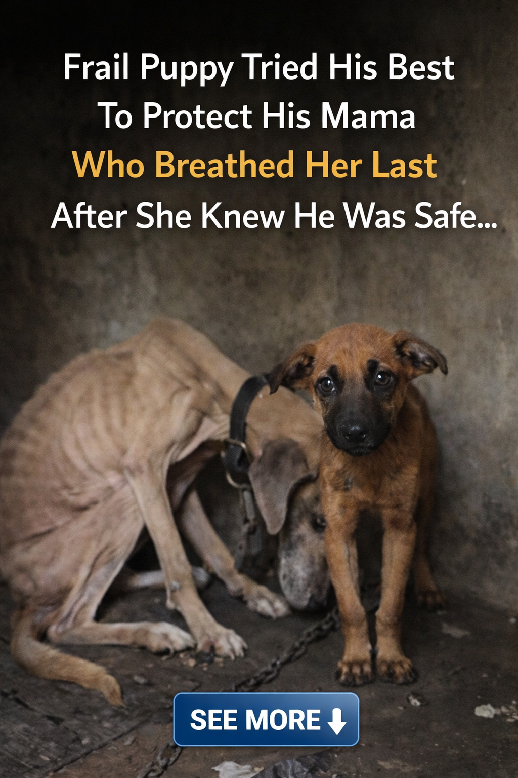 1. A Rescue from a Cruel Market The story begins at a market, where a skeletal mother dog was kept in chains while her tiny, weak puppy tried his best to stand in front of her to protect her. Both were in a state of total exhaustion, their bones protruding after being starved for many days. Rescuers decided to “buy” them to secure their freedom and save these two miserable souls.