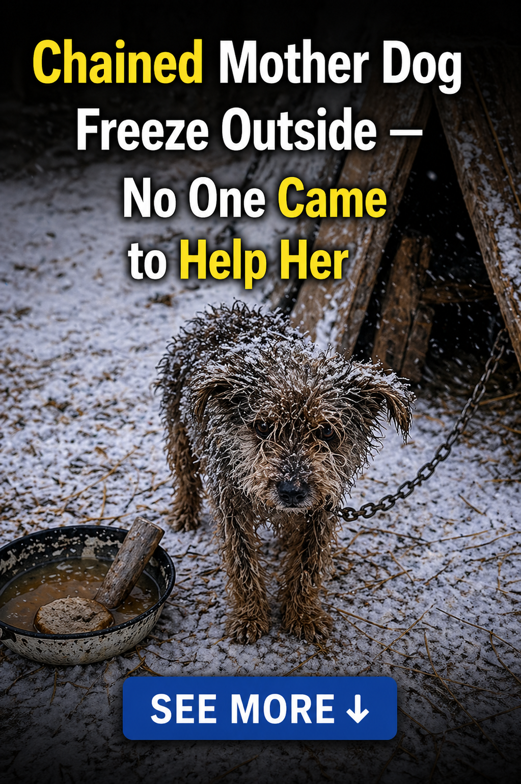 In the biting cold of winter, a heartbreaking scene unfolded in a small yard that most passersby ignored. A mother dog stood frozen, tethered by a short, heavy chain to a collapsing shack. Beside her, four frail puppies struggled to stay alive, huddled together for warmth in a life that had known only neglect.