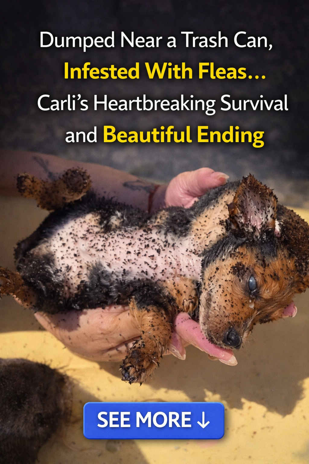 Carli was found in a heartbreaking situation: dumped right next to a public trash can. When rescuers approached, her tiny body was infested with thousands of fleas and covered in grime. In the heat and surrounding refuse, Carli could only huddle and wait for a miracle that she didn’t even know was possible.