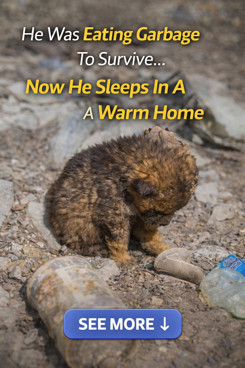 The story begins with a rescue call about a puppy abandoned in a filthy, trash-filled area. His only “home” at the time was a torn cardboard box with a few dirty old clothes inside to keep him warm. To survive day by day, the little puppy had to eat whatever garbage he could find.