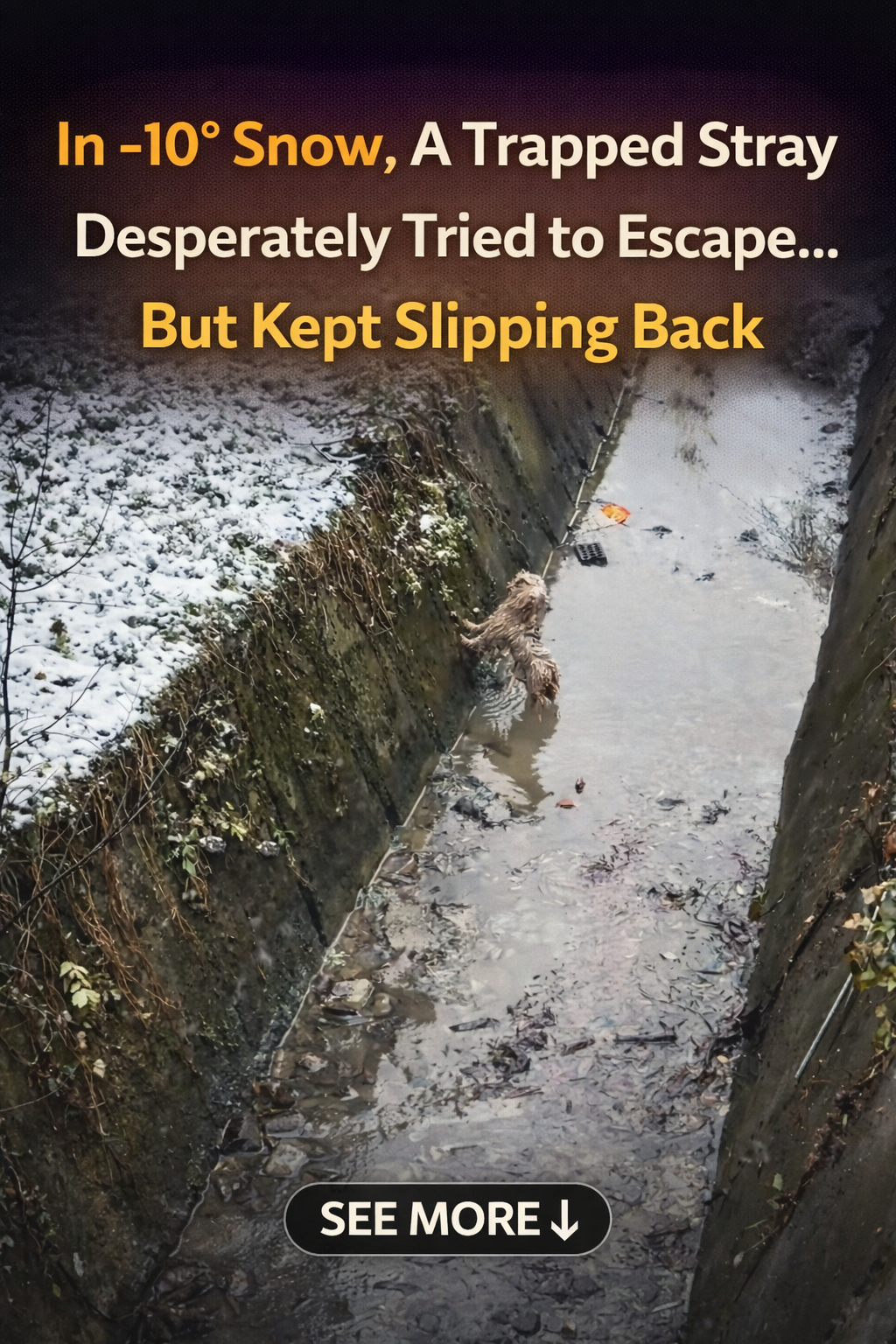 On a freezing winter night with temperatures dropping to -10°C, a desperate bark for help from a drainage canal changed the fate of a small living soul. A couple on their way home heard the cries and discovered a stray dog trapped in a deep ditch, desperately trying to escape but repeatedly slipping back due to the ice and snow.