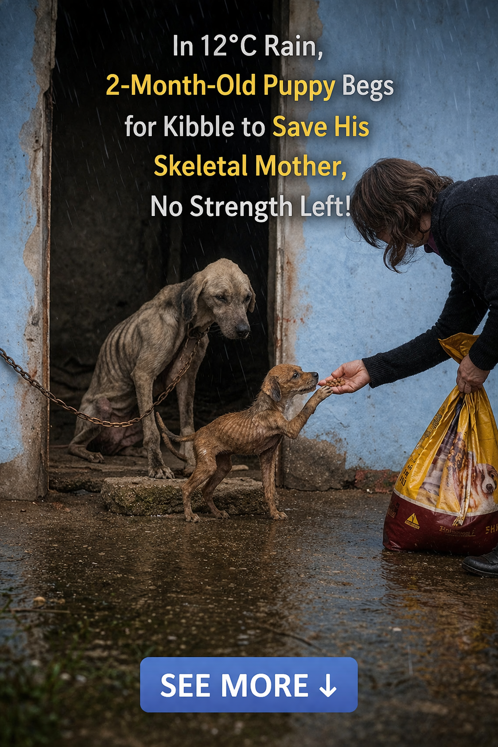 In 12°C Rain, 2-Month-Old Puppy Begs for Kibble to Save His Skeletal Mother, No Strength Left!