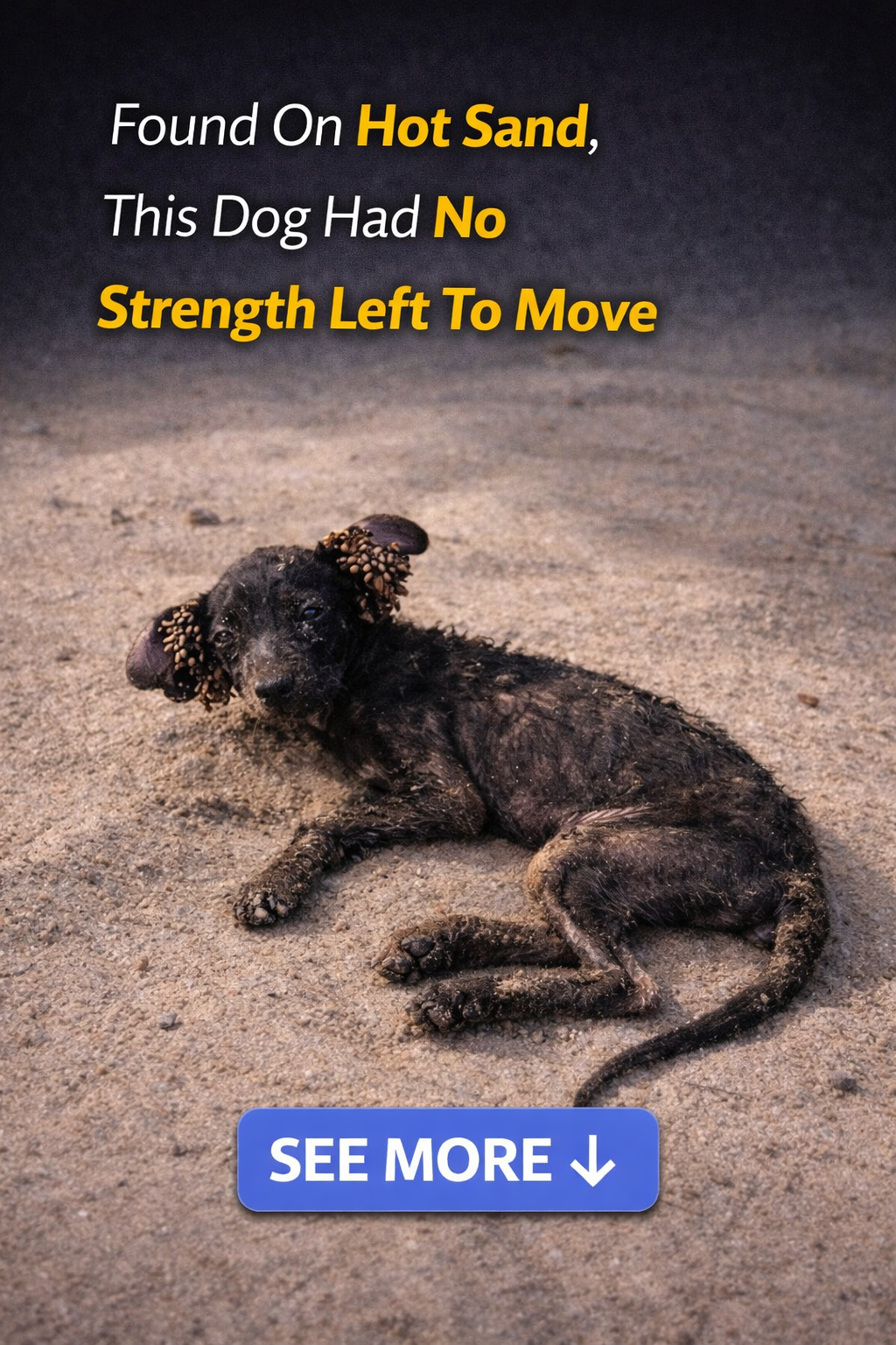 Oreo was discovered crawling slowly across scorching hot sand, his body so emaciated that his ribs protruded sharply beneath his dirty skin. The tiny puppy seemed to have no strength left; his ears were badly swollen and infested with countless ticks.
