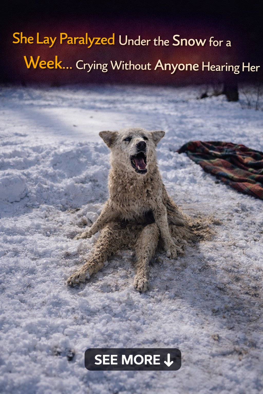 Lunka, the name given to this poor dog, was abandoned in the forest by her owners after her body became paralyzed. To them, a dog that could no longer walk was merely a “useless” burden. Lunka lay there, solitary and in pain amidst the freezing snow for an entire week, her cries fading into the void with no one to hear them.