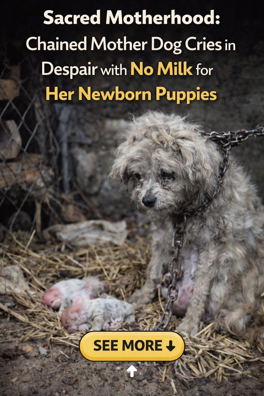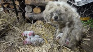 While cleaning out an abandoned sawmill, a man heard a soul-piercing cry. He discovered a thin mother dog with filthy, matted fur, chained by a heavy rope that prevented her from moving more than 2 meters. At her feet were four puppies, only a few hours old, their bodies still wet and shivering in the sub-zero temperatures.
