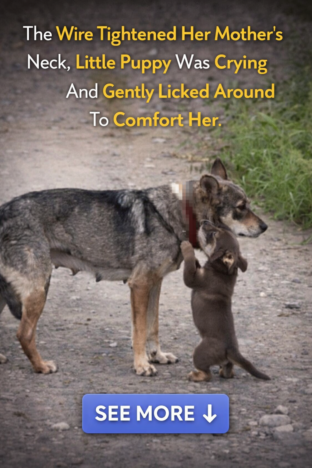 The Tightening Wire and Loneliness Weeks ago, the mother dog was intentionally trapped by someone who tied a steel wire tightly around her neck. The harder she tried to run away to escape, the deeper the wire sliced into her flesh, creating deep and agonizing open wounds. Throughout that period of neglect and pain, no one helped; only her puppy stayed by her side, constantly licking around the wounds to comfort her.
