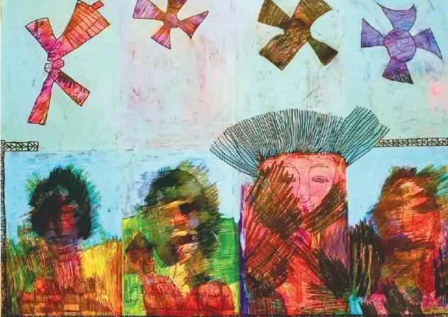 One young woman fills her drawings with figures in native clothing, since Nvo Sevori, their very gifted teacher, often suggests they look at pictures from National Geographic for inspiration. Another drew a picture that features a panda cradling a baby, surrounded by Native Americans and soldiers. Still others favor unclassifiable creatures, colorful portraits, and geometric patterns.