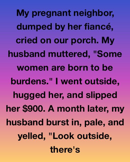 I peeked through the kitchen window and saw Sarah from next door. Eight months pregnant, hands braced under her belly, leaning against the porch railing, shaking as if the wood itself was all that kept her upright.