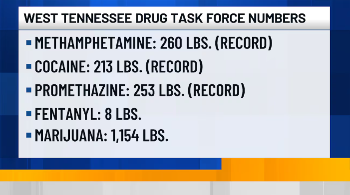Agents seized nearly 1,900 pounds of drugs across six West Tennessee counties, Shelby, Haywood, Crockett, Gibson, Dyer, and Lake, setting new records for different types of drugs, including methamphetamine, cocaine, promethazine, fentanyl and marijuana.