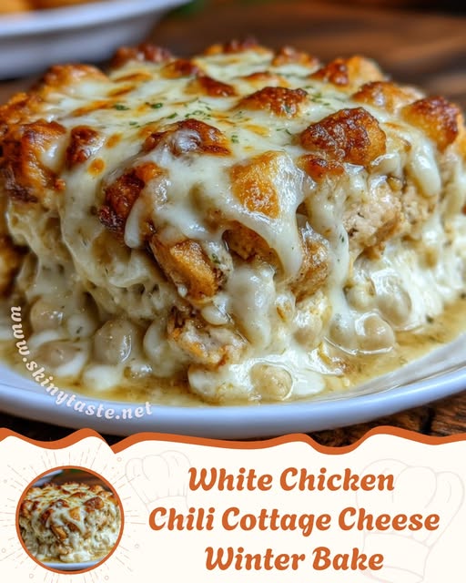 When it comes to cold-weather comfort food, nothing delivers warmth, creaminess and protein-packed satisfaction quite like this White Chicken Chili Cottage Cheese Winter Bake. Inspired by classic white chicken chili but reimagined as a hearty, bubbling casserole, this dish layers shredded chicken, mild green chiles, creamy cottage cheese and tender white beans under a golden crown of melted mozzarella. It’s the kind of cozy, family-style winter bake that fills the house with warmth long before it reaches the table. With its rich texture, snowy-white chili base and lightly browned, bubbly top, it’s a dish that looks and tastes like pure comfort.