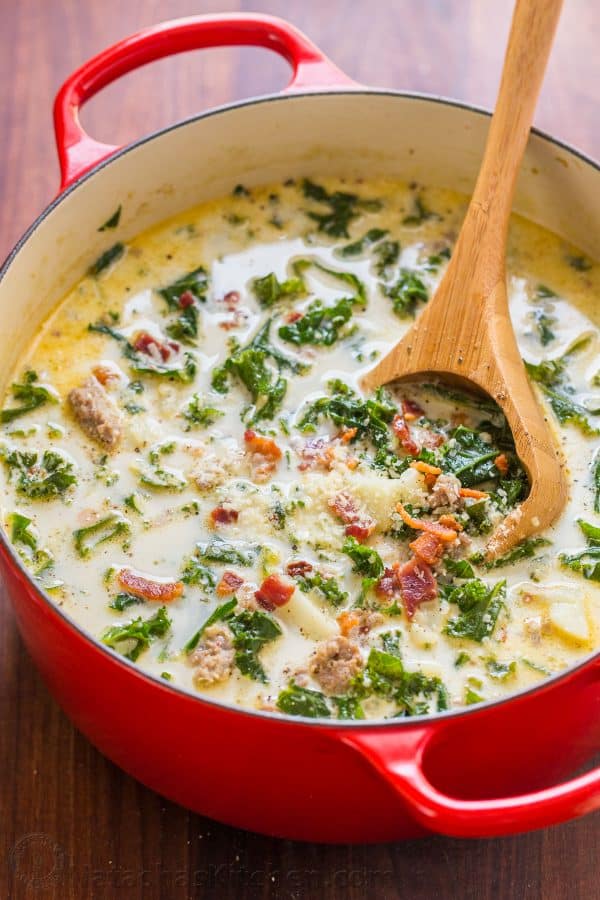 Zuppa Toscana is Olive Garden’s most popular soup. This one-pot, homemade Zuppa Toscana recipe is hearty and loaded with Italian sausage, kale, bacon and potatoes.